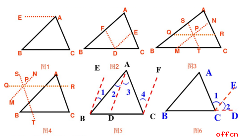 第一題:三角形內(nèi)角和定理的證明方法主要是通過添加輔助線,你還能舉出幾種嗎?畫圖展示即可。