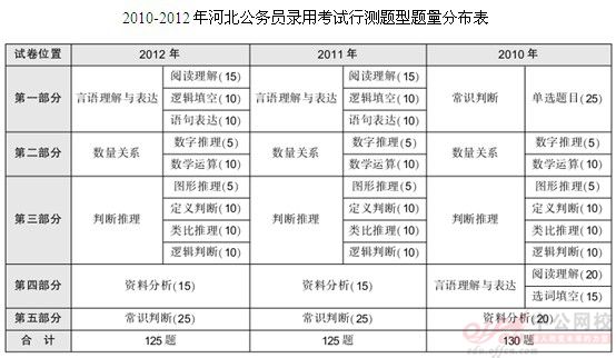 中公教育專家在深入研究河北 的基礎(chǔ)上,總結(jié)了河北行測考試各個(gè)部分的命題特點(diǎn),并結(jié)合公務(wù)員考試的整體發(fā)展變化情況,分析未來河北省行測考試的命題確實(shí),幫助大家從整體上認(rèn)識(shí)河北公考,把握備考方向,學(xué)習(xí)效率。下表是2010、2011、2012年河北公務(wù)員考試行測部分的基本情況: