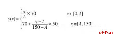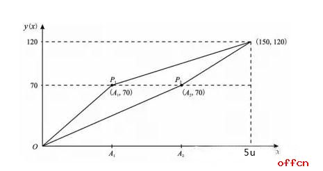 舉例來說,設(shè)兩個(gè)科目的合格分?jǐn)?shù)線分別為 A1和 A2,則轉(zhuǎn)換分 y(x) 關(guān)于原始成績x的函數(shù)圖像,如下圖所示: