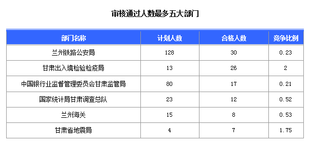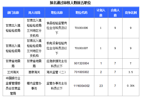 報(bào)名通過(guò)審核人數(shù)前五的職位主要集中在甘肅省出入境檢驗(yàn)檢疫局、甘肅省地震局、蘭州海關(guān)等部門,具體信息如下: