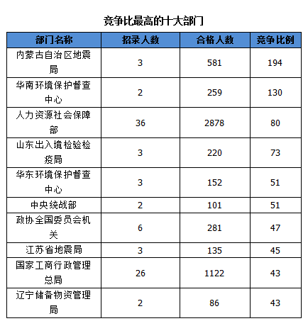 與上午九時(shí)數(shù)據(jù)相比,報(bào)名人數(shù)最多十大部門清一色為國稅部門,報(bào)名人數(shù)最多的山東國稅,招660人,共6404人報(bào)名,報(bào)名人數(shù)翻倍增長,目前競爭最激烈的部門是內(nèi)蒙古地震局,招錄3人,已經(jīng)有581人報(bào)名,成為截止目前最“擁堵”的部門。