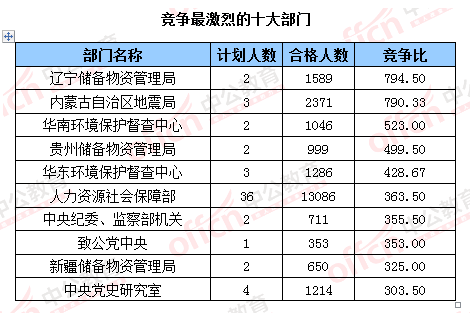 競爭最激烈的兩個部門——遼寧儲備物資管理局與內蒙古自治區(qū)地震局“并駕齊驅”,競爭比分別達到794.5:1和790.3:1。