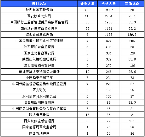 截止到24日18時,通過審核人數前三位的部門依次是:陜西省國家稅務局、西安鐵路公安局、中國銀行業監督管理委員會陜西監管局,三部門通過審核總人數達24707人,占通過審核總人數的81%。