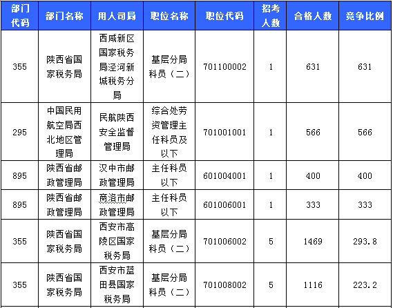 截止到24日18時,競爭最激烈的職位為陜西省國家稅務局西咸新區涇河新城稅務分局基層分局科員(二)一職,該職位招錄1人,通過人數為631人,競爭比高達631:1!