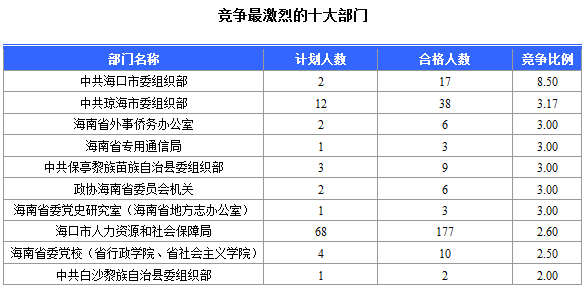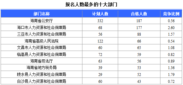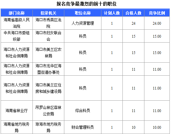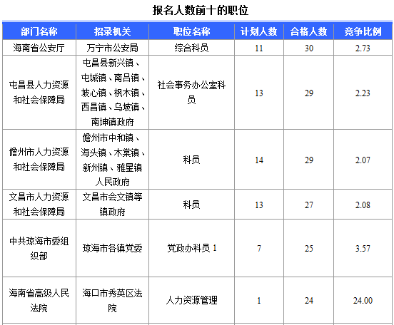 報名通過審核人數前十的職位主要集中在海南省高級人民法院、海口市人力資源和社會局、海南省林業廳,具體信息如下: