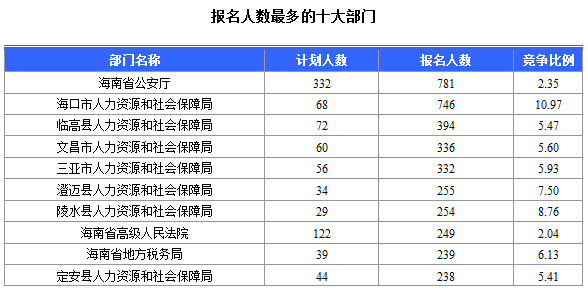 截至15日16時,報名人數前三位的部門依次是:海南省公安廳、海口市人力資源和社會局、臨高縣人力資源和社會局,三部門報名總人數達1921人,占報名總人數的26.1%。