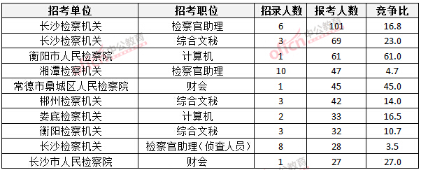 為幫助廣大考生更清晰的了解報名情況,湖南中公網校整理了湖南檢察院系統各職位的報名人數排名以及競爭比例排名,供廣大考生參考: