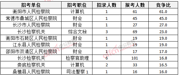據湖南中公網校統計,截至2016年3月26日17:00,2016年湖南檢察院報名人數總計為1245人,整體競爭比例為3.12:1。16個職位暫時無人報考,競爭最熱職位是衡陽市人民檢察院 計算機,競爭比例為61:1。