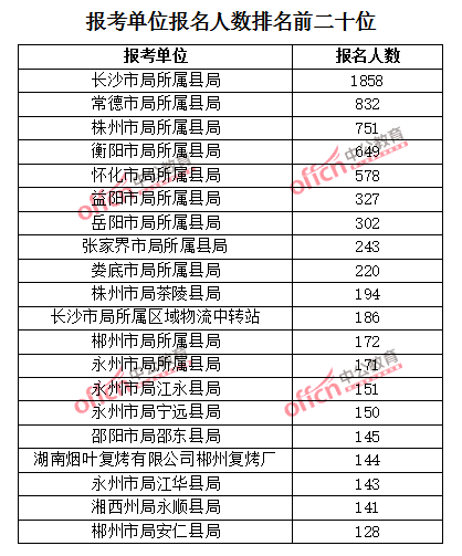 截止26日17時時,依然是長沙市局所屬縣局報名人數最多,報名人數為1858人,占總報名人數的19.9%。其次是常德市局所屬縣局,832人報名,22個報考單位報名人數超過100人,其中5個報考單位報名人數超過500人。