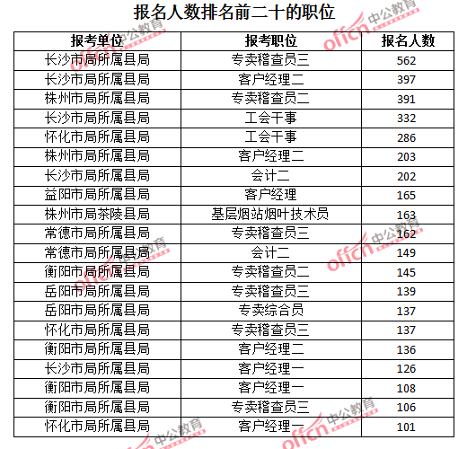 截止26日17時時,2016年湖南煙草局招聘報名人數前二十的職位中,長沙占5個,總人數1619人,占比為17.3%。具體信息如下: