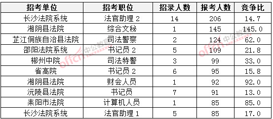 為幫助廣大考生更清晰的了解報名情況,湖南中公教育整理了湖南法院系統各職位的報名人數排名以及競爭比例排名,供廣大考生參考: