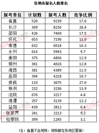 湖南公務(wù)員全省報(bào)名人數(shù)超過(guò)5000人的地區(qū)有省直、長(zhǎng)沙、邵陽(yáng)、懷化、永州和常德六個(gè),報(bào)名人數(shù)在3000-5000之間的地區(qū)有8個(gè),報(bào)名人數(shù)在 2000-3000之間的地區(qū)有3個(gè)。其中,湖南公務(wù)員報(bào)名人數(shù)最多的地區(qū)是省直,為9239人;報(bào)名人數(shù)最低的地區(qū)是檢察院,為1245人。