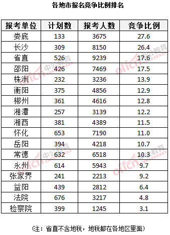 截止26日17時(shí),湖南省公務(wù)員考試報(bào)考競(jìng)爭(zhēng)比例整體為11.65:1,婁底、長(zhǎng)沙、省直、邵陽(yáng)、株洲、衡陽(yáng)、郴州、湘潭、湘西、懷化、岳陽(yáng)和常德超過(guò)10:1,省直報(bào)考競(jìng)爭(zhēng)比例為17.6:1。