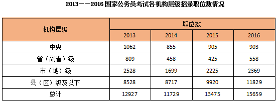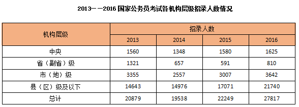 據中公網校根據官方發布的職位表統計,2013年到2016年國家公務員考試中央、省(副省)級、市(地)級、縣(區)級及以下這四個機構層級共招錄的人數為分別為20879人、19538人、22249人和27817人。2013年到2016年這四年間,中央和省(副省)級的招錄人數基本持平,2014年市(地)級招錄人數較2013年下降了798人,2015年較2014年回漲450人,2016年增漲勢頭持續,招錄的人數較2015年增加了635人。縣(區)級及以下在2013年到2016年這4年間實現“三連漲”,招錄漲幅分別是2.27%、13.98%、27.35%,2016年較2015年的漲幅創造了歷年之最。此次國考,縣(區)級及以下機構招錄的職位數、人數均在增加,體現了國家重視基層用人這一傾向,對于立志扎根基層、為人民服務的廣大考生來說無疑是好消息。