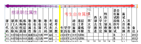 仔細研究不難發現,國考職位表的設置是具有高度科學性的,合理有序。前面幾列是招錄職位本身的性質,如部門名稱、職位名稱、部門代碼、職位代碼、機構性質、機構層級、職位屬性、職位簡介、考試類別、招錄人數等;后面幾列是對考生的要求,如考生的專業、學歷、學位、政治面貌、基層工作經驗、是否是“四項目人員”等。既然知道了這個職位表布局原理,我們就能更好地入手“多快好省”地找到適合自己的職位了。
