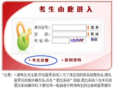 點擊進去之后會轉入到登錄及注冊頁面,首先點擊“考生注冊”進入注冊頁面。