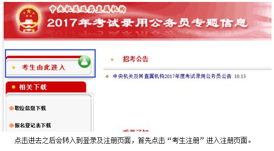 首先打開中央機關及其直屬機構2017考試錄用公務員專題信息網頁http://bm.scs.gov.cn/2017/UserControl/Student/StudentIndex.aspx,點擊“考生由此進入”
