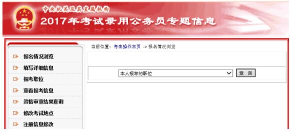 第二步:進入錄用系統界面考生操作主頁之后,點擊右上角“報名情況瀏覽”按鈕進入報名情況瀏覽頁面。