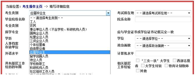 請仔細閱讀《報考指南》,確定自己的考生類別。“考生類別”這里不是指考生要參加的公務員類別,而是指當前的身份狀態。比如你現在在私企工作,那就應該選填私營企業人員。