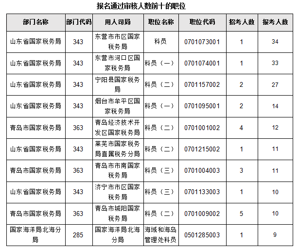報名通過審核人數前十的職位由山東省國家稅務局包攬了9成,從首日報名情況來看,國稅依然為最搶手的部門。
