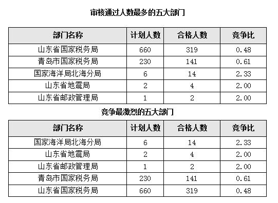 截止到15日16時,通過審核人數前三位的部門依次是:山東省國家稅務局、青島市國家稅務局、國家海洋局北海分局,過審人數分別為319人、141人、14人。三部門過審人數共474人,占總過審人數的99%。