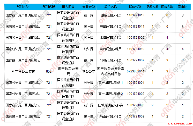 通過審核人數(shù)前十的職位主要集中在國家統(tǒng)計(jì)局廣西調(diào)查總隊(duì)和部門和南寧鐵路公安局,具體信息如下: