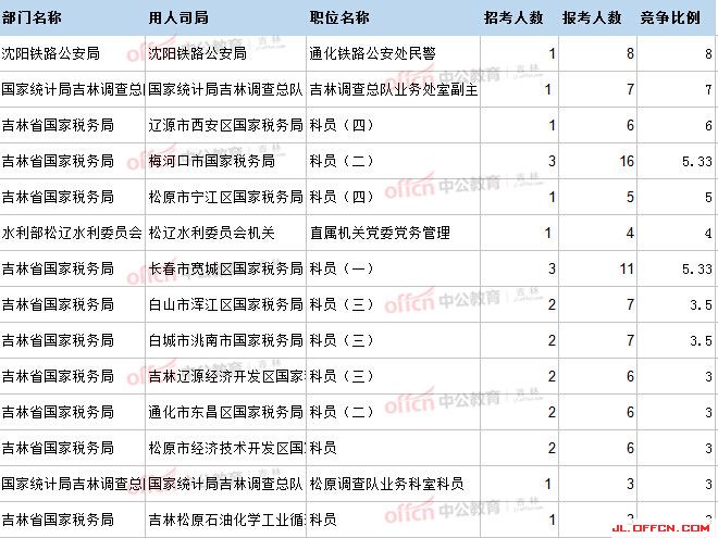 截止到15日16時,競爭比例的職位為梅河口市國家稅務局(科員二)一職,招錄3人,截止到15日16時通過人數為16人。