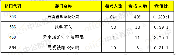 截止15日17時,通過審核人數前四位的部門依次是:云南省國家稅務局、昆明海關、云南煤礦安全監察局、昆明鐵路公安局,三部門通過審核總人數達439人,占通過審核總人數的84.42%。