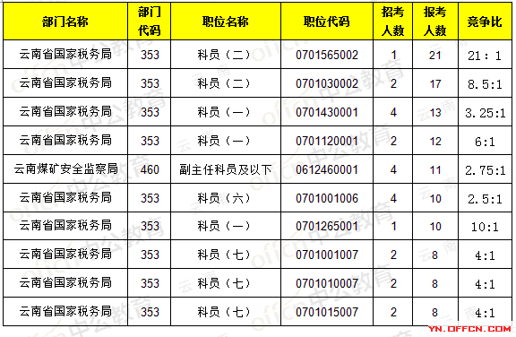報名通過審核人數前十的職位主要集中在云南省國家稅務局、云南煤礦安全監察局,具體信息如下: