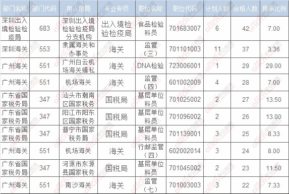 截止到15日16時(shí),競爭比例的職位為廣州海關(guān)廣州白云機(jī)場海關(guān)緝私分局DNA檢驗(yàn)一職,招錄1人,截止到15日16時(shí)通過人數(shù)為29人。