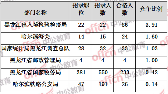 為幫助廣大考生更清晰的了解今日報(bào)名情況,黑龍江中公網(wǎng)校整理了審核通過人數(shù)前六位的部門以及競爭比例最激烈的六大部門,供廣大考生參考: