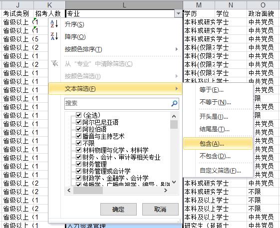 由于專業要求一欄包含的內容繁多,通過普通篩選來尋找適合自己的職位“工作量”較大,因此中公網校專家建議考生使用文本篩選,通過搜索專業關鍵字來定位想要尋找的專業,職位選擇效率。文本篩選的操作方法是:在篩選中點擊【文本篩選】,選擇【包含】,在文本框中輸入想要查詢的專業,確定后專業要求列中顯示的即為篩選后的專業。