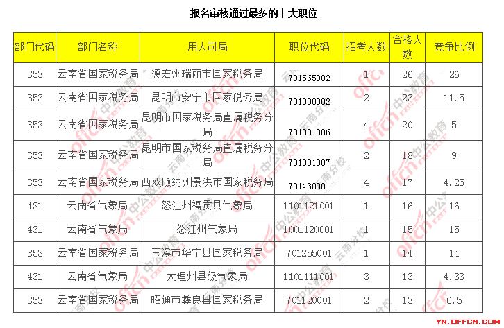 報名通過審核人數前十的職位主要集中在云南省國家稅務局、云南氣象局,具信息如下: