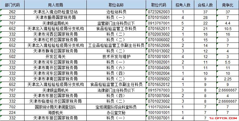 報名通過審核人數前十的職位主要集中在天津出入境邊防檢查總站、天津市薊縣國家稅務局、天津銀監局機關,具體信息如下: