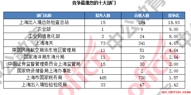 為幫助廣大考生更清晰的了解今日報名情況,上海中公網校整理了審核通過人數前十位的部門以及競爭比例最激烈的十大部門,供廣大考生參考: