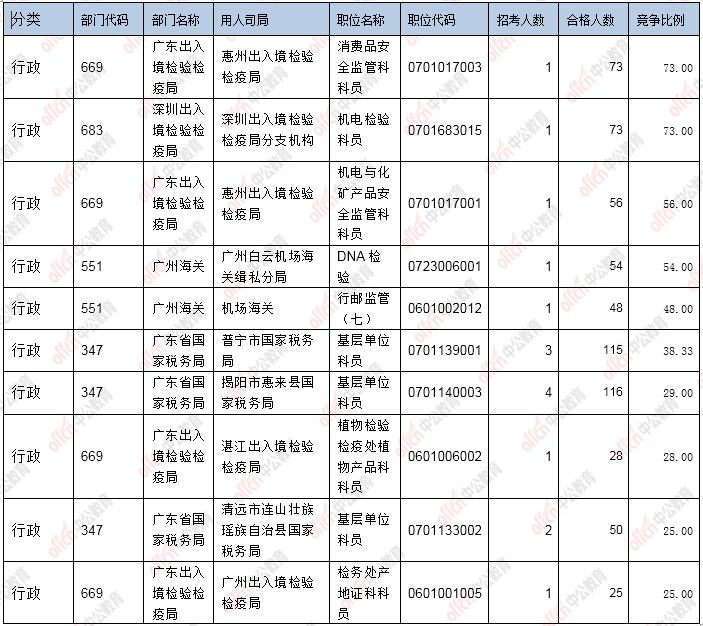 報名通過審核人數前十的職位主要集中在廣東國稅局、廣州海關、深圳海關等部門,具體信息如下: