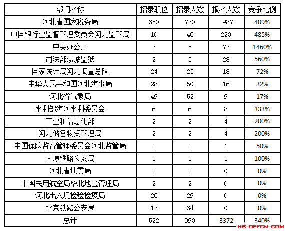 截至17日8時,據河北中公教育統(tǒng)計,2017國考招錄職位中工作地點在河北的職位通過審核總人數為3372,平均競爭比例為3.4:1。