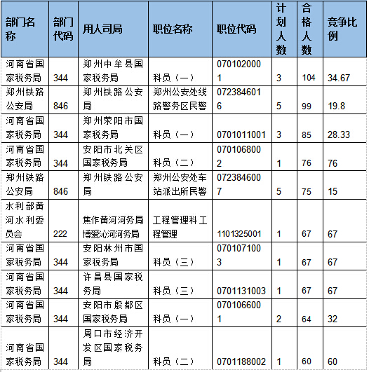 報名通過審核人數排名前列的職位主要集中在河南省國家稅務局、鄭州鐵路公安局、水利部黃河水利委員會等,具體信息如下: