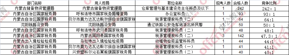 報名通過審核人數前十的職位主要集中在內蒙古儲備物資管理局、內蒙古固陽縣國家稅務局、內蒙古土默特右旗國家稅務局等部門,具體信息如下: