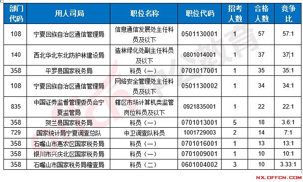 截止到17日16時(shí),競(jìng)爭(zhēng)比例的職位為寧夏回族自治區(qū)通信管理局信息通信發(fā)展處主任科員及以下一職,招錄1人,截止到17日16時(shí)合格人數(shù)為57人,具體信息如下: