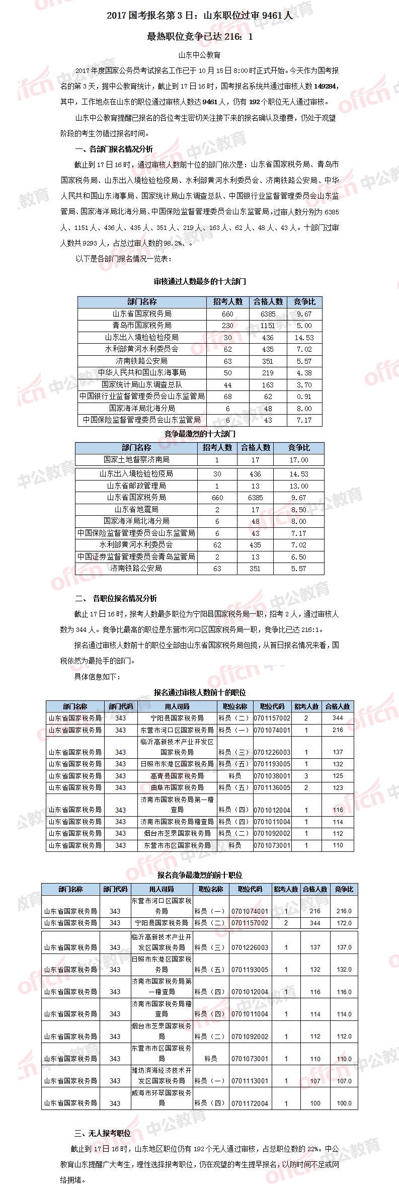 【截至17日16時】2017國考報名山東職位過審9461人 最熱職位競爭已達216:1