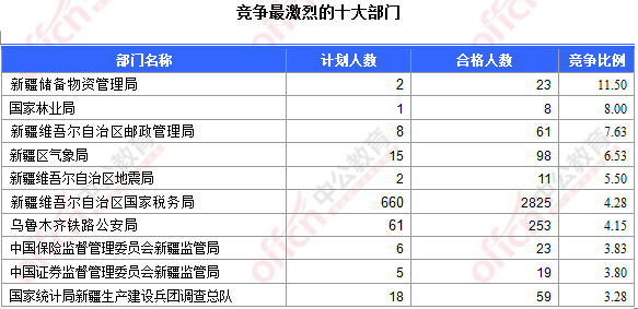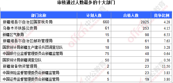 為幫助廣大考生更清晰的了解今日?qǐng)?bào)名情況,新疆中公網(wǎng)校整理了審核通過(guò)人數(shù)前十位的部門以及競(jìng)爭(zhēng)比例最激烈的十大部門,供廣大考生參考: