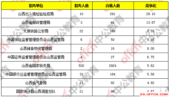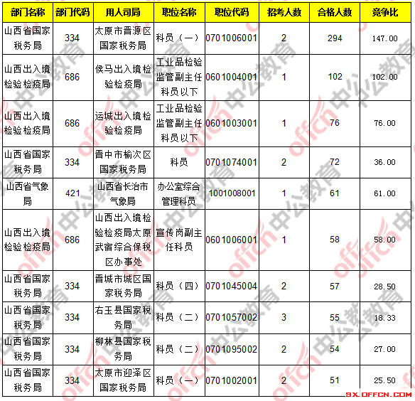 報考人數(shù)前十的職位主要集中在山西省國家稅務(wù)局、山西出入境檢驗檢疫局這兩個部門,具體信息如下: