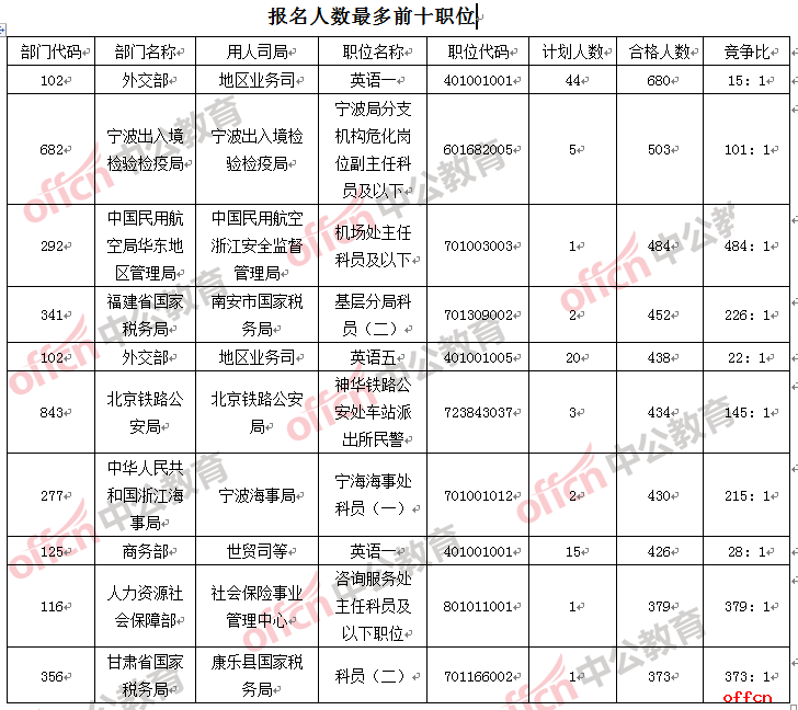 從報(bào)名人數(shù)上來看,截止至18日8時(shí),報(bào)名人數(shù)超過400的崗位有8個(gè)。外交部地區(qū)業(yè)務(wù)司(職位代碼401001001)一職,從昨日躍居至“人氣”后,人氣依舊不減,報(bào)名人數(shù)比17日下午相比,增加84人,引來了680人的“競相追逐”,與去年同期報(bào)名人數(shù)最多的888人相比,可以看出,今年的報(bào)考者非常理性,錯(cuò)開了“擁堵”崗位,增加了成“公”幾率。寧波出入境檢驗(yàn)檢疫局(職位代碼601682005)一職,比昨日下午的426人,增加77人報(bào)考。中國民用航空局華東地區(qū)管理局中國民用航空浙江安全監(jiān)督管理局機(jī)場處主任科員及以下(職位代碼701003003)一職,因比昨日下午增加105人報(bào)考,而上升了2個(gè)名次,位居第三位。