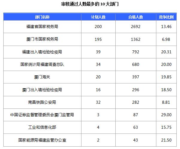 截止到18日8時,通過審核人數前三位的部門依次是:福建省國家稅務局、廈門市國家稅務局、福建出入境檢驗檢疫局,三部門通過審核總人數達4846人,占通過審核總人數的71%。