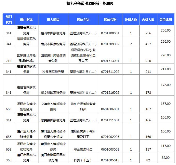 報名通過審核人數(shù)前十的職位主要集中在南安市國家稅務(wù)局、福清市國家稅務(wù)局、國家統(tǒng)計局福建調(diào)查總隊等部門,具體信息如下: