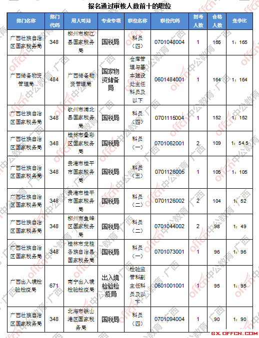 報名通過審核人數前十的職位主要集中在廣西壯族自治區國家稅務局、廣西儲備物資管理局、廣西出入境檢驗檢疫局等部門,具體信息如下:
