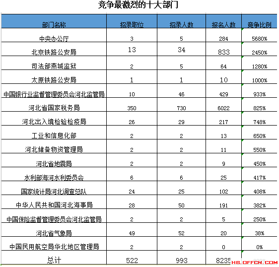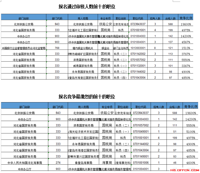 為幫助廣大考生更清晰的了解今日報名情況,河北中公網校整理了審核通過人數前十位的部門以及競爭比例最激烈的十大部門,供廣大考生參考: