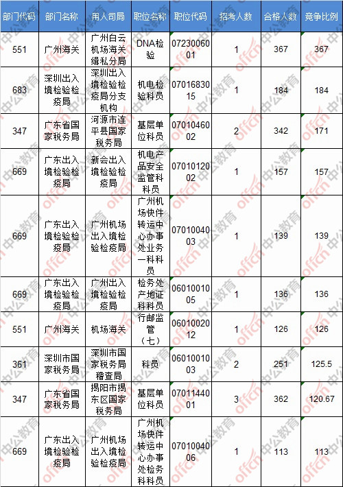 截止到18日16時(shí),競(jìng)爭(zhēng)比例的職位為廣州海關(guān)廣州白云機(jī)場(chǎng)海關(guān)緝私分局DNA檢驗(yàn)一職,招錄1人,截止到18日16時(shí)通過(guò)人數(shù)為367人。