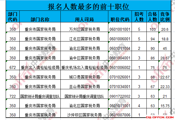 截止到18日16時,競爭比例的職位為‘重慶機場出入境檢驗檢疫局’一職,招錄1人,截止到18日8時通過人數為75人。但是還有少數崗位沒有人去報名。